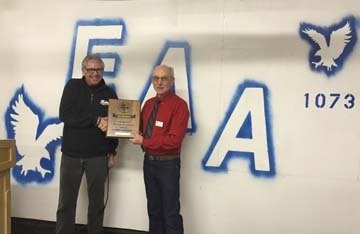 Tim LoDolce, president of the Truckee chapter of the Experimental Aircraft Association presents Tom Meadows with an award for giving more than 1,000 youngsters airplane rides as part